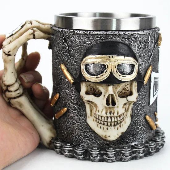 С обеих сторон этой кружки изображены черепа в мотоциклистских шлемах в касках с очками, окруженные пулями. Посередине находится готический крест, а ручка - выполнена в виде руки скелета.