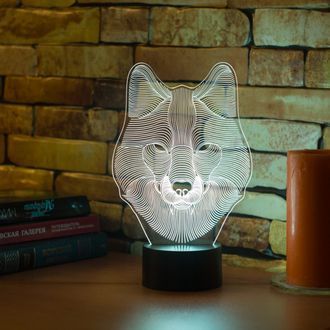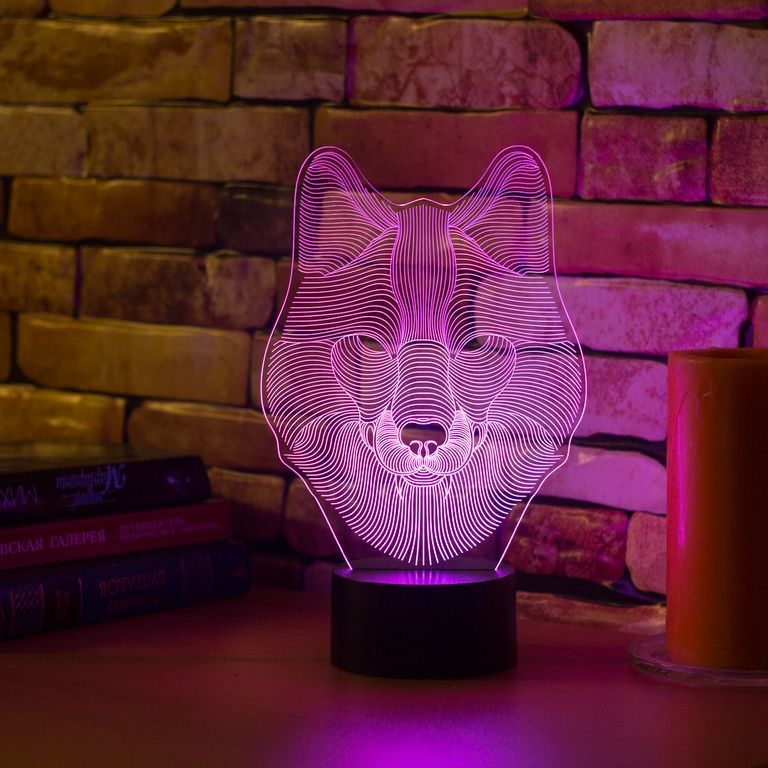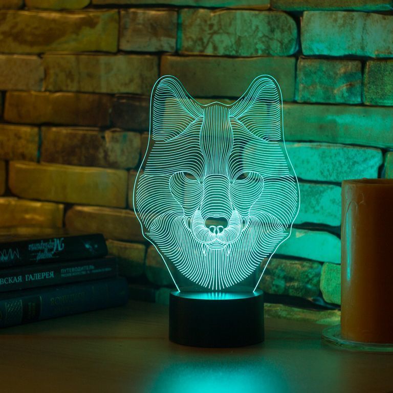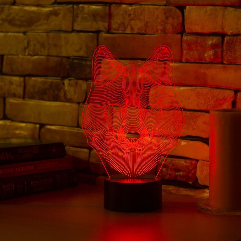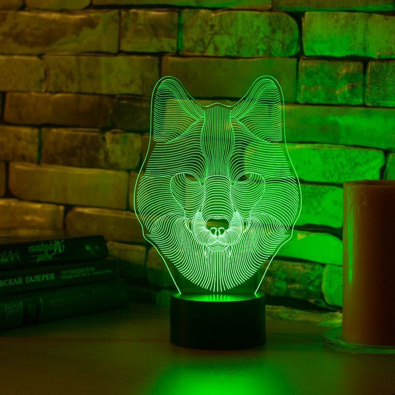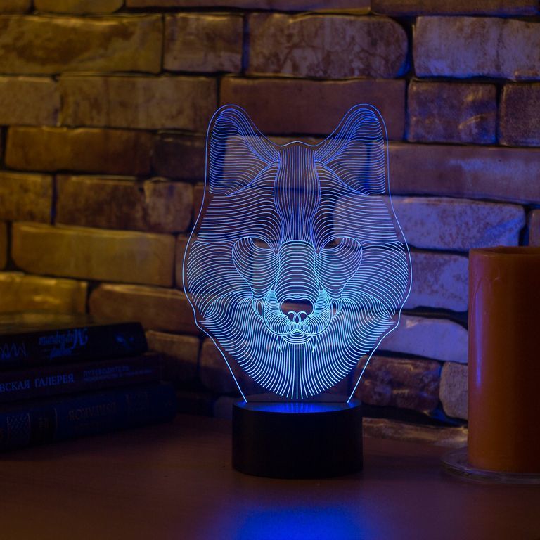 3D лампа Волк Wolf с иллюзией 3D работает от USB провода или от 3-х батареек ААА.