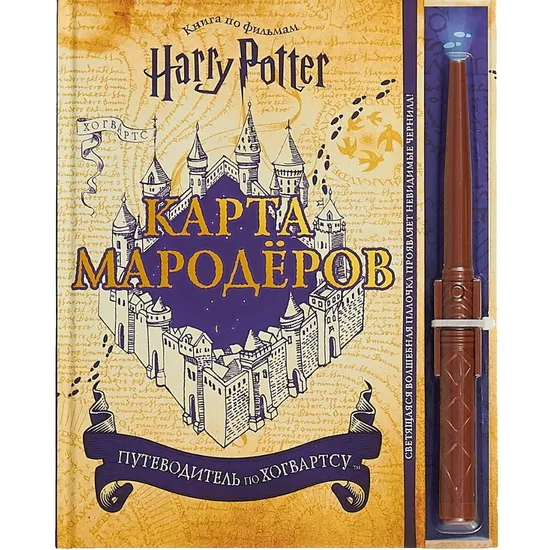 Эта книга раскроет все секреты Хогвартса. Разверни четыре раскладывающиеся страницы - там ты найдёшь четыре части волшебной карты. Все её тайны откроет фонарик на волшебной палочке: посвети им на страницу и узнай, что скрывает Карта Мародёров. А с помощью маркера с невидимыми чернилами, который хранится внутри волшебной палочки, ты сможешь нарисовать собственную тайную карту.