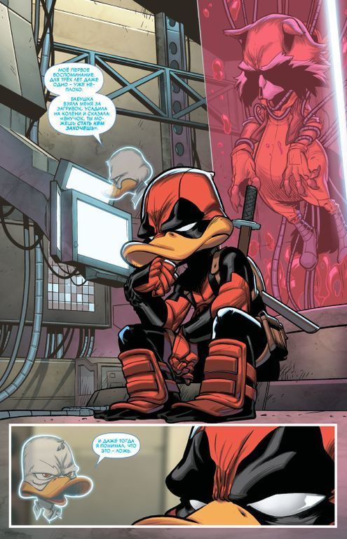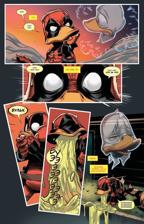 ЧТО ПОЛУЧИТСЯ, если взять циничную антропоморфную утку (по имени Говард) и скрестить её с самым болтливым наёмником вселенной Marvel? Дэдпул Утка, вот что! Когда Уэйд Уилсон соглашается выполнить задание З.А.Щ.И.Т.Ы и поймать инопланетное существо, простые догонялки оборачиваются кое-чем посерьёзнее. Одно попадание не в то место и не в то время заставляет Дэдпула и Говарда бороться друг с другом за власть над их отныне общим телом! Но как с этим связана зловещая мегакорпорация «Роксон»? При чём тут Реактивный Енот? Смогут ли Дэдпул и Говард начать работать сообща, чтобы вернуться в собственные тела? Или Уэйд навсегда окажется заперт в теле утки?!