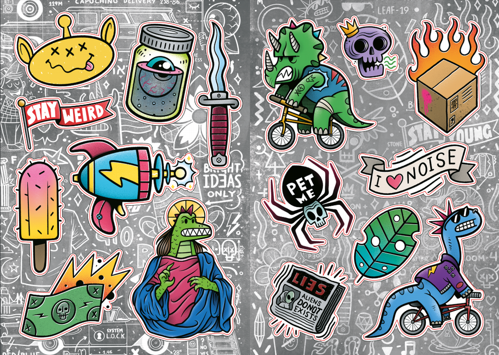 В «TomatoZero Vol. 1» вы найдёте полсотни красочных иллюстраций! Можно подарить полюбившийся стикер другу, или смело украсить буквально любую поверхность изображением, например, панка-трицератопса на велосипеде!