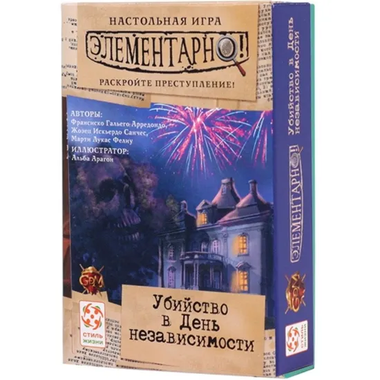 Элементарно! это кооперативная игра-детектив, в которой вам нужно раскрыть преступление всем вместе при помощи информации на картах. Анализируйте полученные сведения, открывайте нужные карты и сбрасывайте те, которые, по вашему мнению, не имеют отношения к делу.Страшная находка. 4-го июля, после того, как отгремели праздничные фейерверки в честь Дня независимости, в поместье семьи Роквалли обнаружено тело неизвестного мужчины. Неужели кто-то из членов этого богатого и уважаемого в округе семейства может оказаться замешан в ужасном преступлении? Исследуйте поместье вдоль и поперёк и установите истину!Сориентироваться на местности. В кооперативной игре-детективе Убийство в День независимости из серии Элементарно! игрокам предстоит собрать все возможные улики по делу о найденном в роще неопознанном трупе. Данные осмотра жертвы, свидетельские показания жителей поместья, обстановка в доме и вокруг него и даже карты окрестностей кто знает, где обнаружится важная зацепка... Но так как в поместье в роковой вечер было довольно много людей, главная сложность определить, какие из установленных фактов действительно относятся к совершённому преступлению.Поделитесь наблюдениями, коллега! Как и в других играх серии Элементарно!, игроки, выполняющие роль сыщиков, добывают разрозненные сведения, чтобы потом объединить всё, что удалось выяснить, и вместе построить правдоподобную версию произошедшего. У каждого на руках по 2 или по 3 карты (в зависимости от количества игроков) с фактами, и в свой ход игрокам придётся решать, какими из этих фактов поделиться с остальными, а какие отбросить, как не относящиеся к делу. При этом зачитывать текст с карт на руках не разрешается, допустимо лишь упоминать отдельные, особо отмеченные слова.