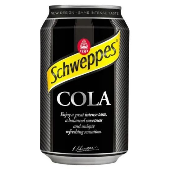 Напиток Schweppes Cola 330мл - это сильногазированный безалкогольный напиток с бодрящим и умеренно сладким вкусом. Он производится на основе очищенной газированной воды с добавлением кофеина и натуральных ароматизаторов. Используется как прохладительный напиток и для приготовления многочисленных коктейлей.