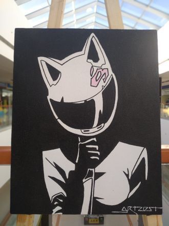 На картине изображена Селти Стурлусон (Сэрути Сутурурусон) — главная героиня сериала Дюрарара, также известная как городская легенда «Чёрный байкер», «Мотоциклист без головы».