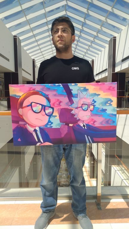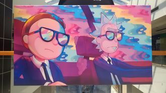На картине изображены Рик и Морти — герои американского комедийного научно-фантастического анимационного сериала, созданного Джастином Ройландом и Дэном Хармоном и выпускаемого в рамках блока Adult Swim на телеканале Cartoon Network.
