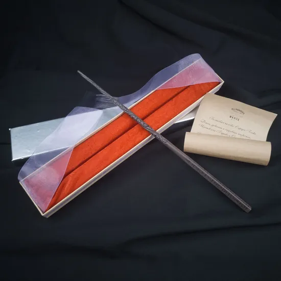 Палочка комплектуется в коробке с фирменным логотипом. Внутри коробочки бархатная подложка и красивая лента. Также к каждой палочке прилагается свиток с характеристиками палочки и ее историей.