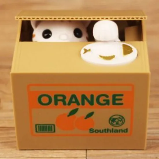 Наша копилка стилизована под транспортировочный ящик, в который каким-то образом пробралась кошка. Стоит вам только оставить ненадолго монетку на ящике, как из него сразу же появится хитрая киска и ловким движением лапы стащит монету. Прекрасный подарок для людей, умеющих правильно хранить деньги, и с хорошим чувством юмора.