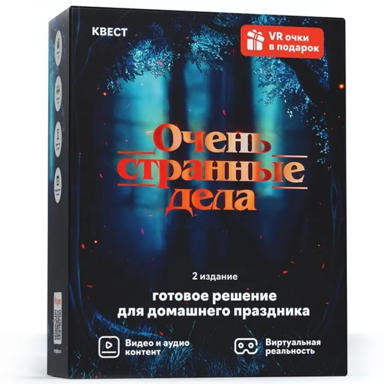 Пришло время окунуться в параллельный мир изнанки и спасти главного персонажа квест-бокса “Очень странные дела”. Соберитесь всей семьей или компанией друзей, дома или на даче, и отправляйтесь в увлекательный мир потусторонних сил!