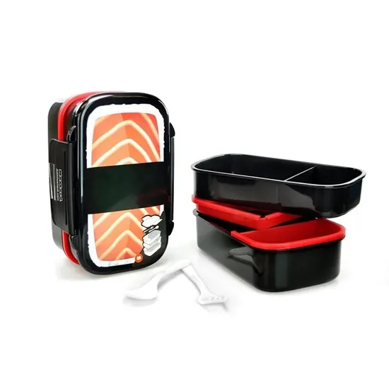 В наборе два контейнера с отсеками, верхняя крышка с удобными защелками, вилка с ложкой. Все составляющие изготовлены из нетоксичного пищевого пластика, который допускает хранение в холодильнике.