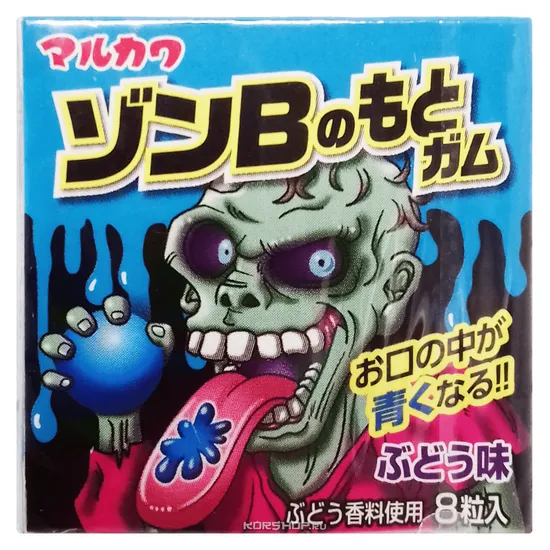 Качественная японская жвачка. Окрашивает язык в синий цвет и позволяет выдувать большие пузыри. Жевательная резинка Зомби со вкусом винограда Marukawa имеет натуральный состав и безопасна для ребенка.