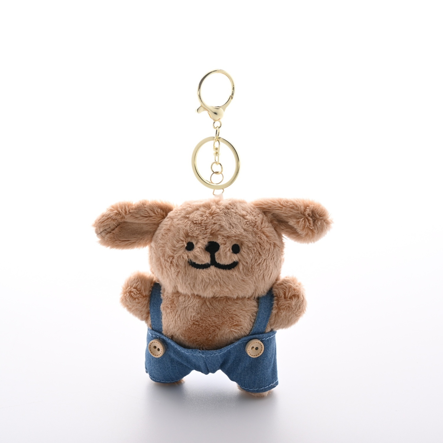 Плюшевая собачка в милом комбинезоне — как маленький персонаж из мультфильма. Смотрится стильно и трогательно, особенно на детских и подростковых рюкзаках.