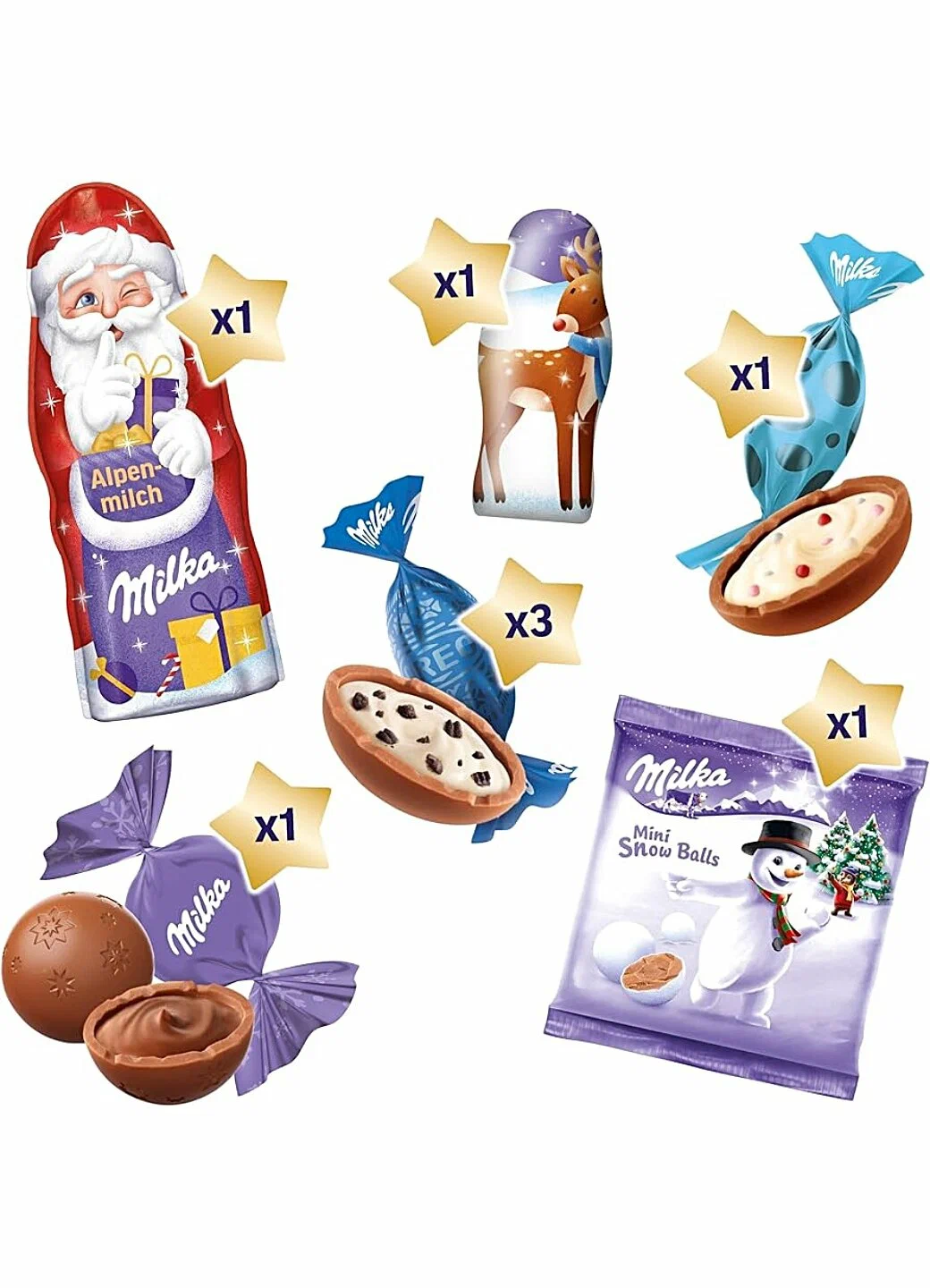 Что внутри: праздничное ассорти Milka (фигурный шоколад и конфеты разных форматов), включая Mini Snow Balls.