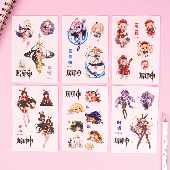 Набор наклеек на шести листах с персонажами культовой компьютерной игры Геншин Импакт (Genshin Impact).
