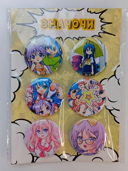 Набор из шести закатных значков (Значочи) с персонажами аниме Lucky Star. Диаметр одного значка - 38 мм. Изображения яркие и сочные. С обратной стороны значка крепление в виде булавки.