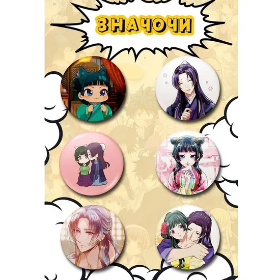 Набор из шести закатных значков с персонажами аниме Монолог фармацевта. Диаметр одного значка - 37 мм. Изображения яркие и сочные. С обратной стороны значка крепление в виде булавки.