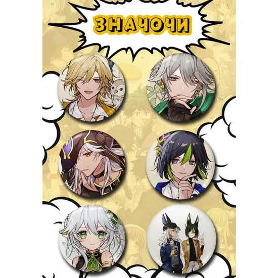 Набор из шести закатных значков (Значочи) с персонажами игры Геншин Импакт. Диаметр одного значка - 38 мм. Изображения яркие и сочные. С обратной стороны значка крепление в виде булавки.