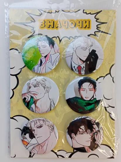Набор из шести закатных значков (Значочи) с персонажами манхва Шампанское и розы. Диаметр одного значка - 38 мм. Изображения яркие и сочные. С обратной стороны значка крепление в виде булавки.