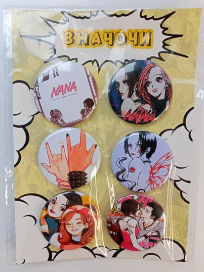 Набор из шести закатных значков (Значочи) с персонажами NANA. Диаметр одного значка - 38 мм. Изображения яркие и сочные. С обратной стороны значка крепление в виде булавки.