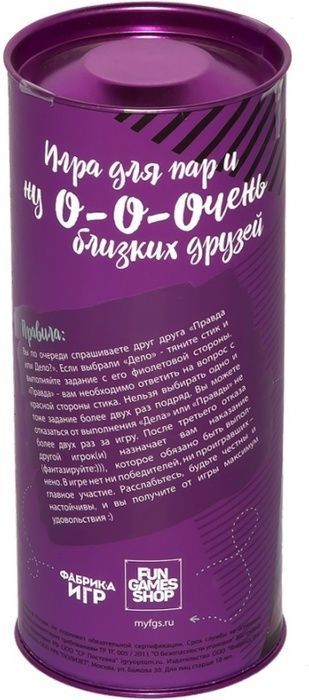 Думаете, что уже всё перепробовали со своим партнёром? Уверены? А ну-ка, бросьте вызов себе и вашей второй половинке. С наборами серии "Правда иди дело" вам предстоит узнать много нового о вашем партнёре, а также проявить себя. А, возможно, вы сможете осуществить что-то, о чём в тайне давно мечтали, но стеснялись попросить. С игрой "Правда или Дело: Для пар" вам не придется ничего придумывать – создатели игры всё уже придумали за вас :)