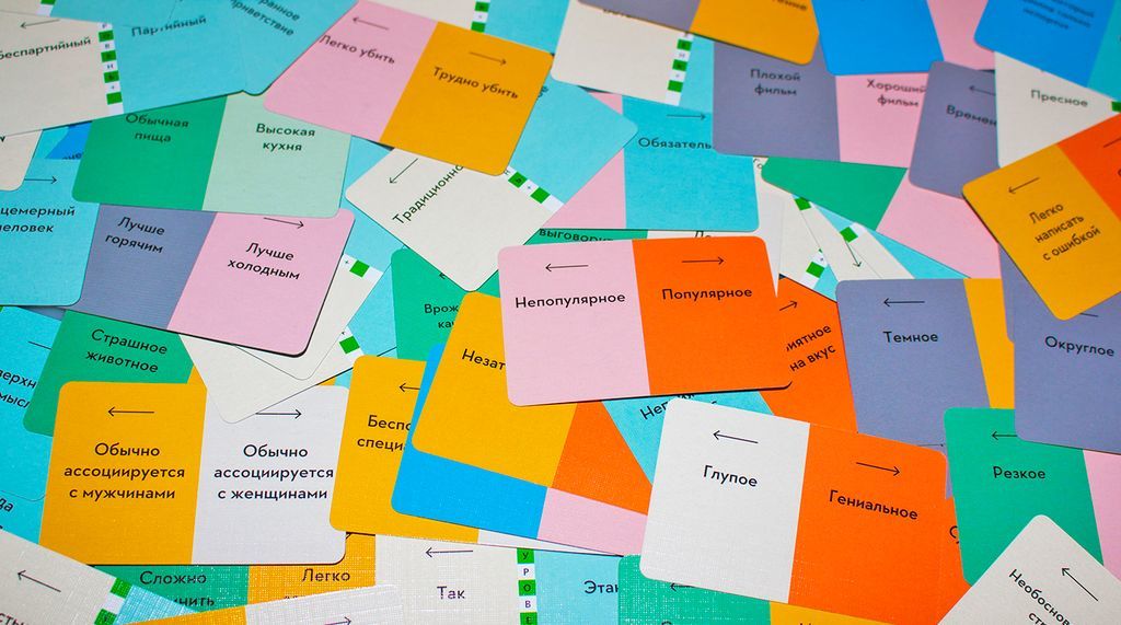 В начале раунда телепат берет из колоды карту с противоположностями. Предположим, ему попалась пара «Горячее – Холодное». Цветная зона находится ближе к понятию «горячее», а значит, в качестве подсказки нужно назвать что-то горячее – но не совсем! Телепат может сказать «кофе» – ведь его обычно пьют горячим. Но существуют вещи и погорячее...