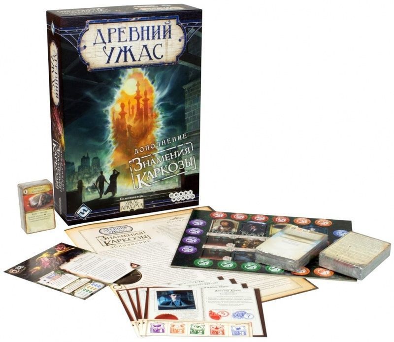 Знамения Каркозы — это третье дополнение к настольной мистической игре Древний ужас, предлагающее нам новых сыщиков, карты мифов, прелюдий, артефакты, заклинания, новых монстров и многое другое для того, чтобы леденящие кровь приключения смогли увлечь вас в бездну страха и психоза. Сыщикам предстоит разгадать тайну безумия, охватившего города по всему миру. Люди в полубреду начинают видеть призрачные шпили потустороннего города и миражи далёкого озера…