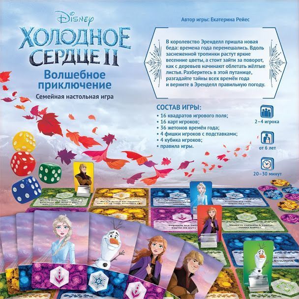 Холодное сердце 2: Волшебное приключение – яркая карточная игра, в которой продолжаются приключения любимых героев одноимённого мультфильма. Игрокам предстоит путешествовать по сказочному королевству, переворачивать квадраты игрового поля, бросать кубики и выполнять различные действия, чтобы собрать жетоны всех времён года. Простые правила и красочные компоненты не оставят детей равнодушными, так что им захочется вернуться к игре снова и снова.