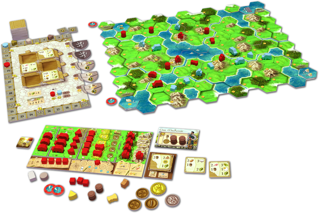 В настольной игре "Кланы Каледонии" игроки берут под своё руководство один из исторических кланов Шотландии, каждый из которых обладает уникальными способностями. Вам предстоит соревноваться в торговле, производстве и экспорте товаров.