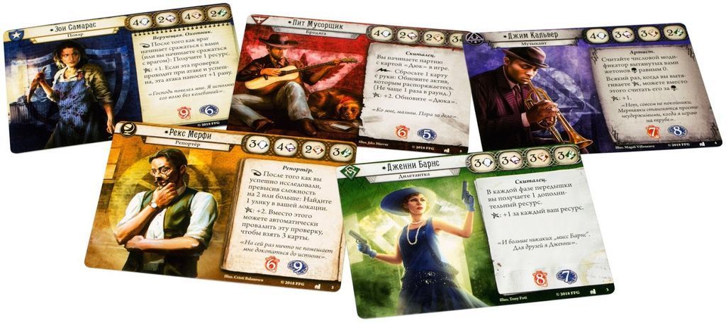 В коробке Вас ожидают два приключения из сюжетного набора “Наследие Данвича”, пять новых сыщиков и Книга приключений.