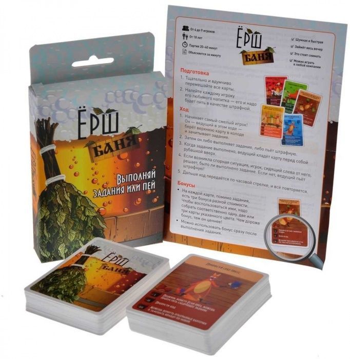 Ёрш — алкогольная игра, которая выносит за один раз целую компанию. Принцип очень простой: надо тянуть карточки со смешными заданиями и выполнять их. Если не хочется — надо выпивать штрафную.