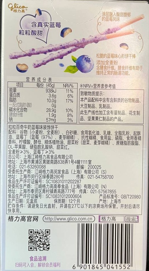 пшеничная мука, сахар, растительное масло (пальмовое/рапсовое), глазурь на основе сахара и растительных жиров, сухое молоко, порошок черники, ароматизаторы, разрыхлители (карбонаты натрия и аммония), эмульгатор (соевый лецитин), соль, красители растительного происхождения.