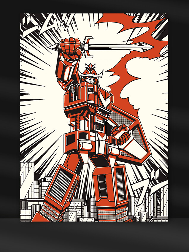 • Стиль: японский меха-арт, ретро-комикс, динамичная иллюстрация