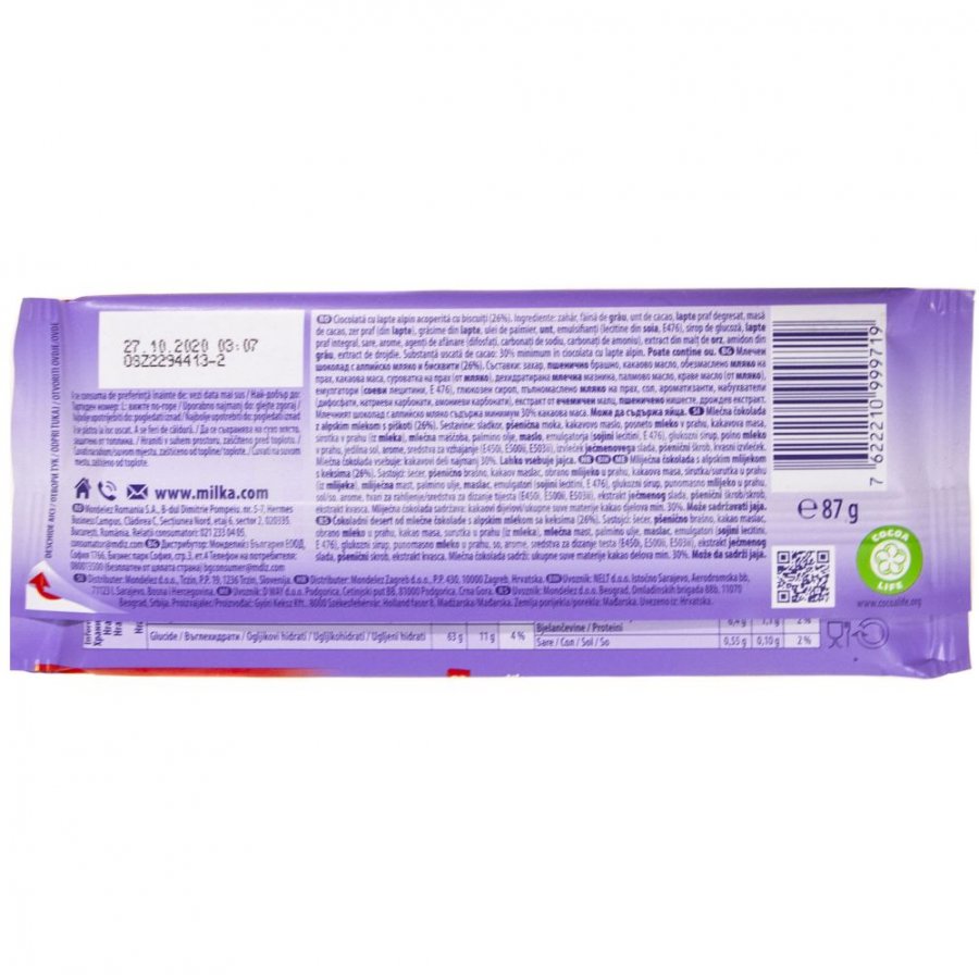 Состав (типовой): сахар, какао-масло, сухое молоко, какао-масса, пшеничная мука (печенье LU), растительные жиры, сухая сыворотка, эмульгатор (соевый лецитин), разрыхлители, соль, ароматизаторы.