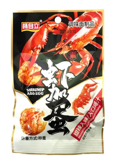 Соевый белок (соевые бобы), вода, растительное масло, соевый соус, сахар, соль, ароматизатор “креветка”, сухой яичный порошок или яйцепродукты, пряности (включая перец чили), усилители вкуса, регуляторы кислотности, загустители и ароматизаторы.