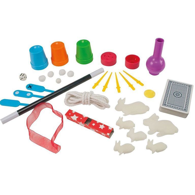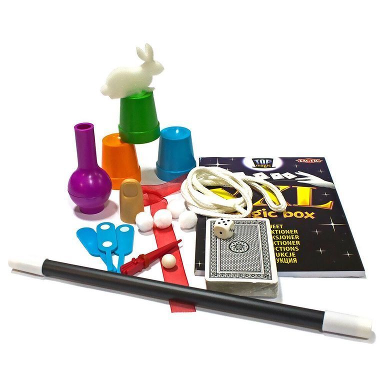 Комплектация : Туннель из картона, кубик и волшебная палочка; три стаканчика разного цвета и четыре мягких шарика; смятая банкнота; накладной палец и ленточка; две лопатки (одна с одной точкой, вторая с двумя точками); пластиковая коробочка с 5 дырками, пластмассовая мон