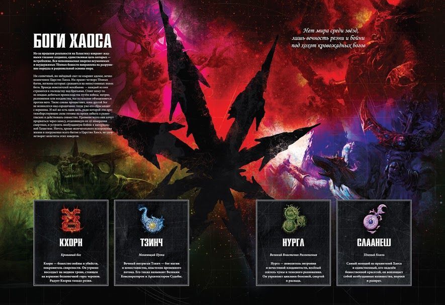 Здесь Вы найдёте описания богов Хаоса: их сущности, мотивов и методов, а также мерзких орд еретиков-астартес: некогда благородных космических десантников, ныне всецело попавших под тлетворное влияние Хаоса и позорящих своё существование, сражаясь за своих тёмных господ.