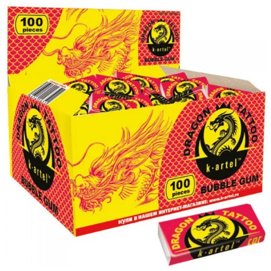 Жевательная резинка «Dragon » с татуировками внутри. Собери все татуировки и воплоти мечту об уникальном рисунке на своём теле! Вкусное удовольствие для любителей жвачек с сюрпризами внутри.